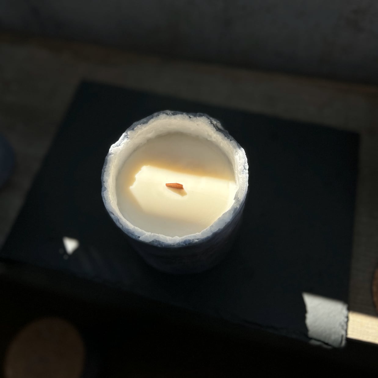 グレーとブルーが絶妙に重なり合い、火をともしたときに色が透けて鮮やかさが増してきます。ブルーは心身を落ち着かせ気持ちを和らげる効果がある色でもあり、よりキャンドルのリラックス効果を感じて頂けます。